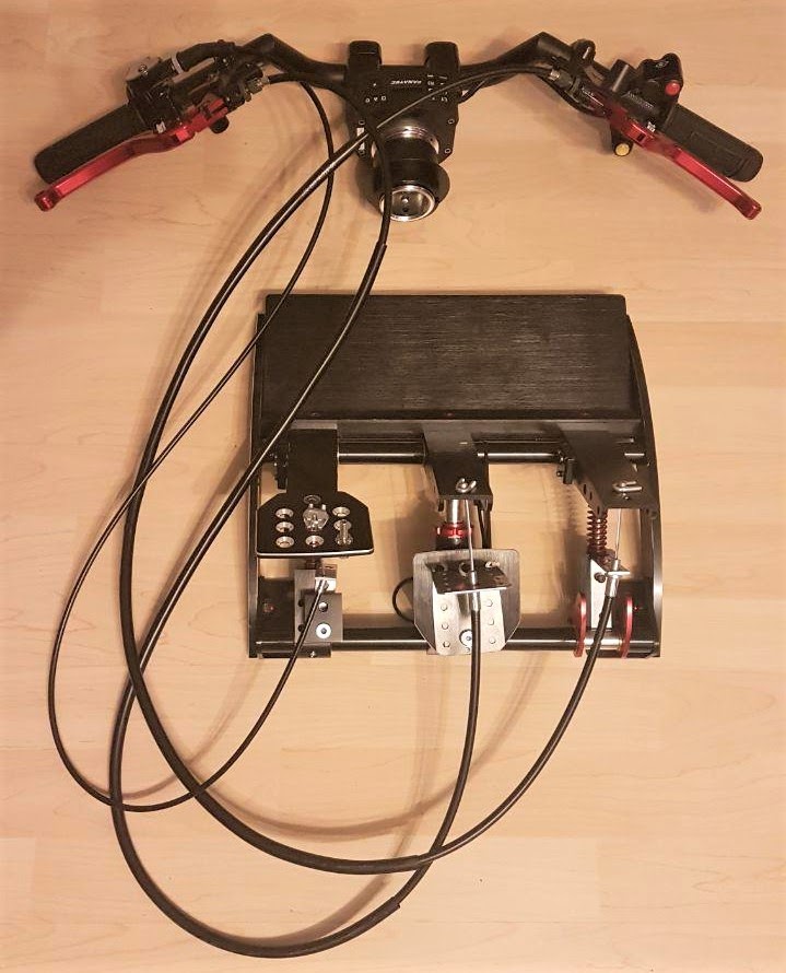 Not Yet, at the moment it's a couple of aluminium profiles build to the shape of an X, the lower parts make sure it can't tip over, one upper part holds the Fanatec DD wheel base and the seat is on the other end but not properly fixed yet. Need to fix the seat and footrests including the foot leavers to control the rear brake and shifting and need to figure out how to detect those inputs. The steering is done, 3 wires go from the throttle, clutch and front brake leaver to the Fanatec ClubSport pedals pulling on each to get those inputs. Buttons on the wheel are wired to the Universal Hub the handlebar is mounted to.